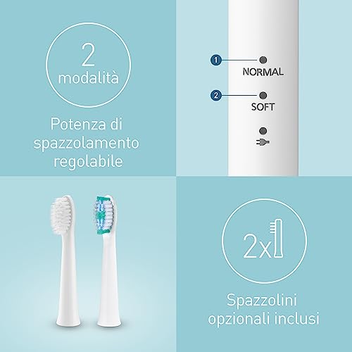 L’alimentazione dello spazzolino protagonista della nostra recensione è affidata ad una batteria al litio ricaricabile tramite cavo. L’autonomia del prodotto non è eccelsa ma dobbiamo rapportare questo dato sia al prezzo relativamente basso, sia allo spessore minimo del manico (che non offre lo spazio per una batteria più grande).